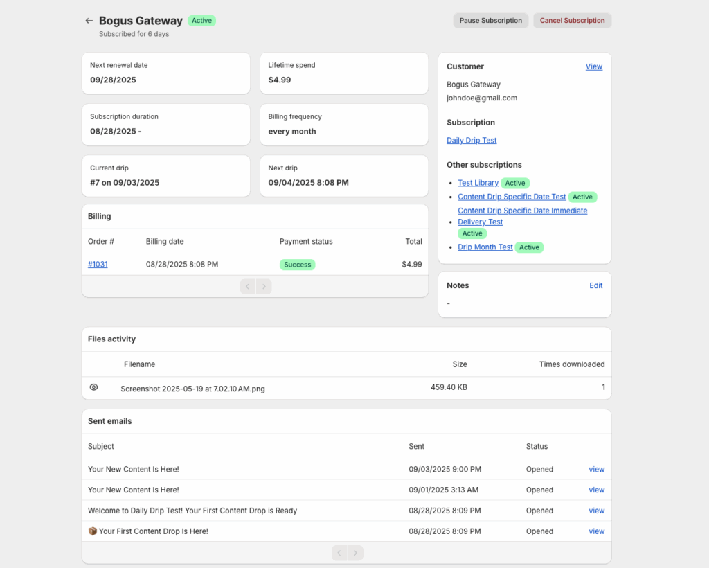 - Subscription status & duration (Active, Paused, or Cancelled).
