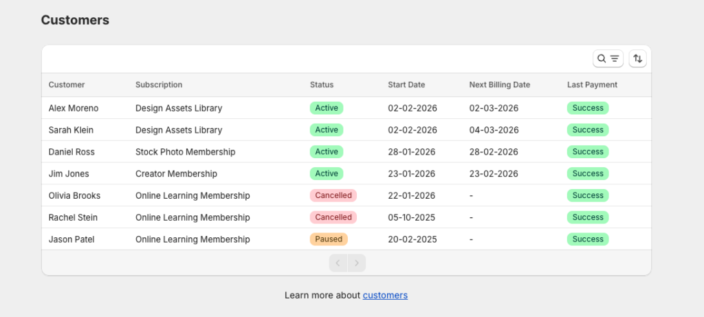 Here you’ll see a list of all customers who have an active, paused, or cancelled subscription.