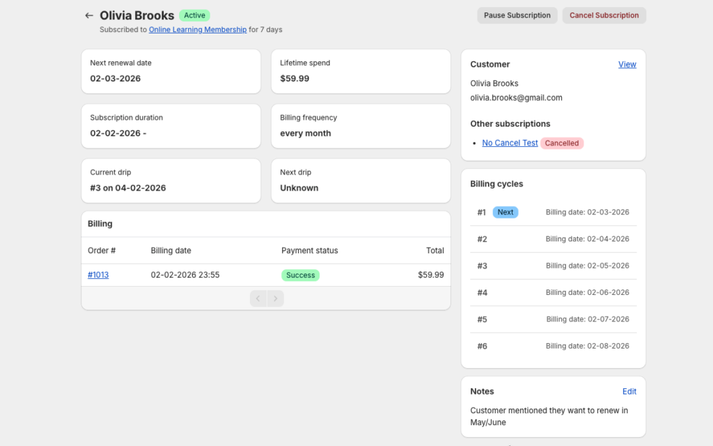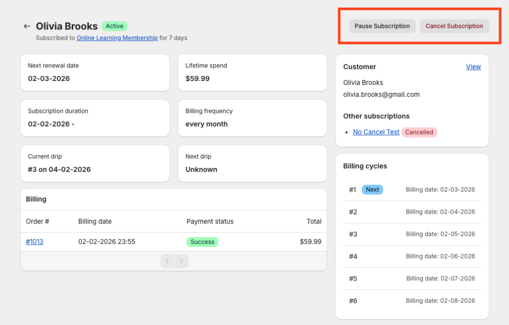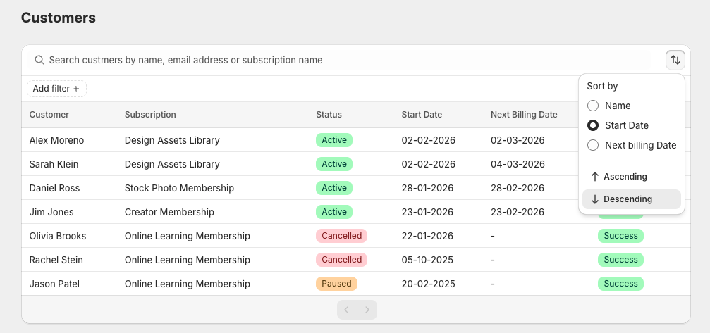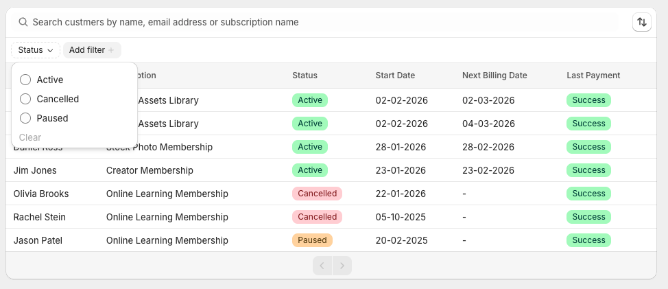 - Subscription status (Active, Paused, Cancelled)
