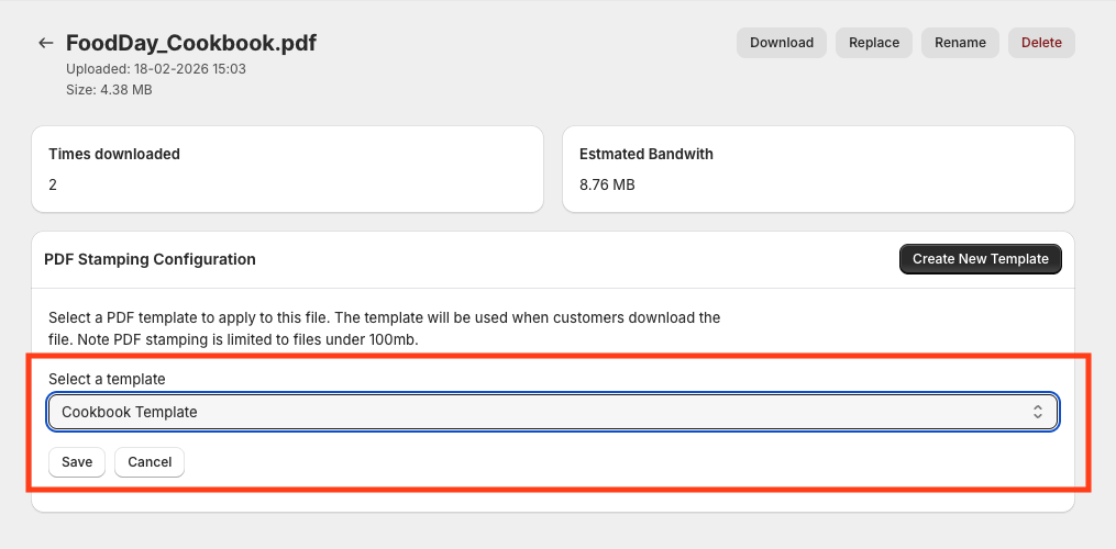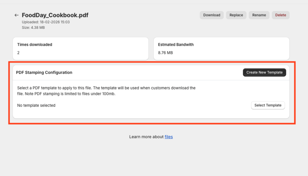 PDF stamping (also sometimes called a watermark) allows you to automatically imprint specific text onto PDF files when customers download them. The stamp can include dynamic information like the customer’s name, email, order number, or subscription details — helping identify the original recipient if a file is shared.