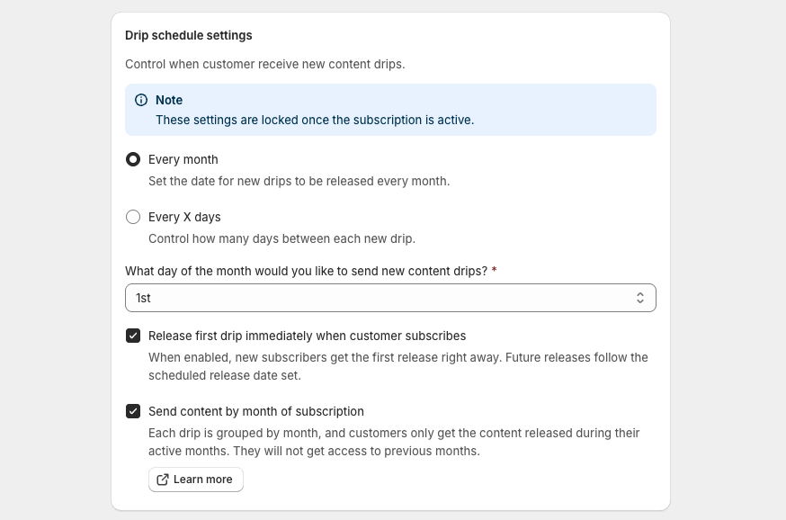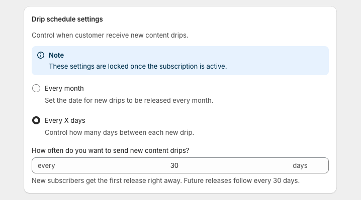 The Drip Schedule determines when subscribers receive new content. (Note: Once a subscription is active, these settings are locked and cannot be changed.)