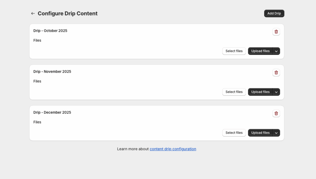 - Release First Drip Immediately – When enabled, new subscribers get their first drip right away, then follow the monthly schedule.
